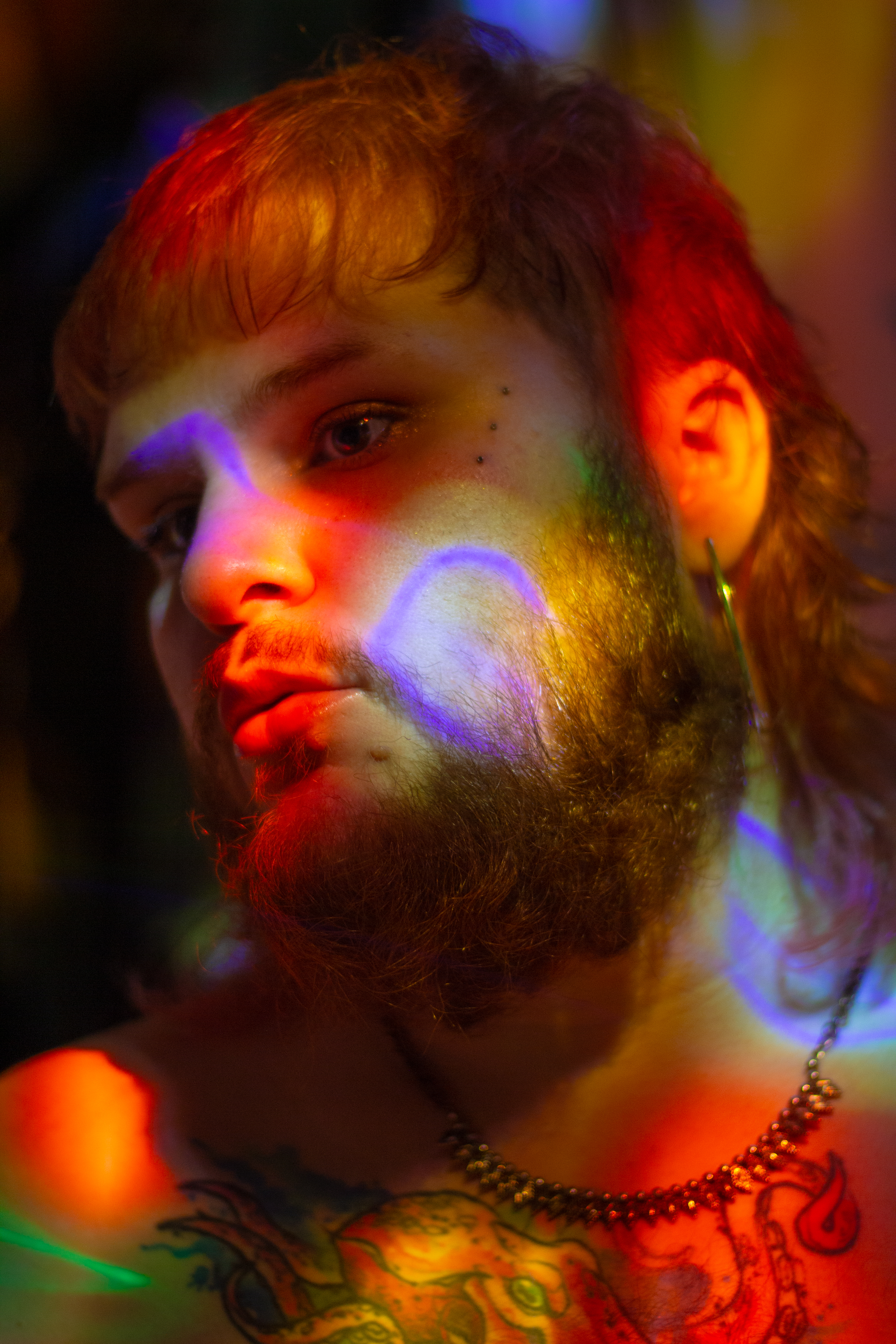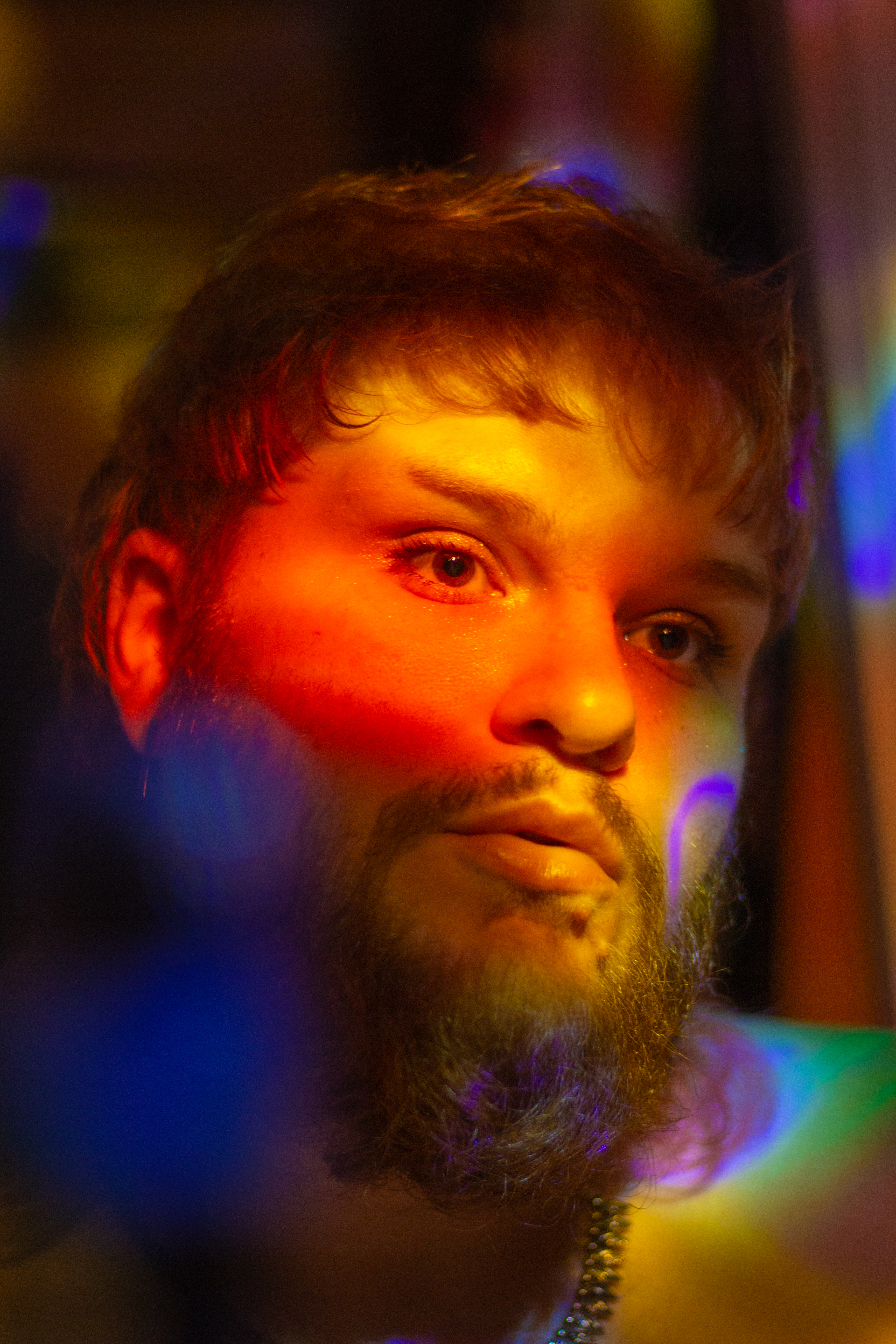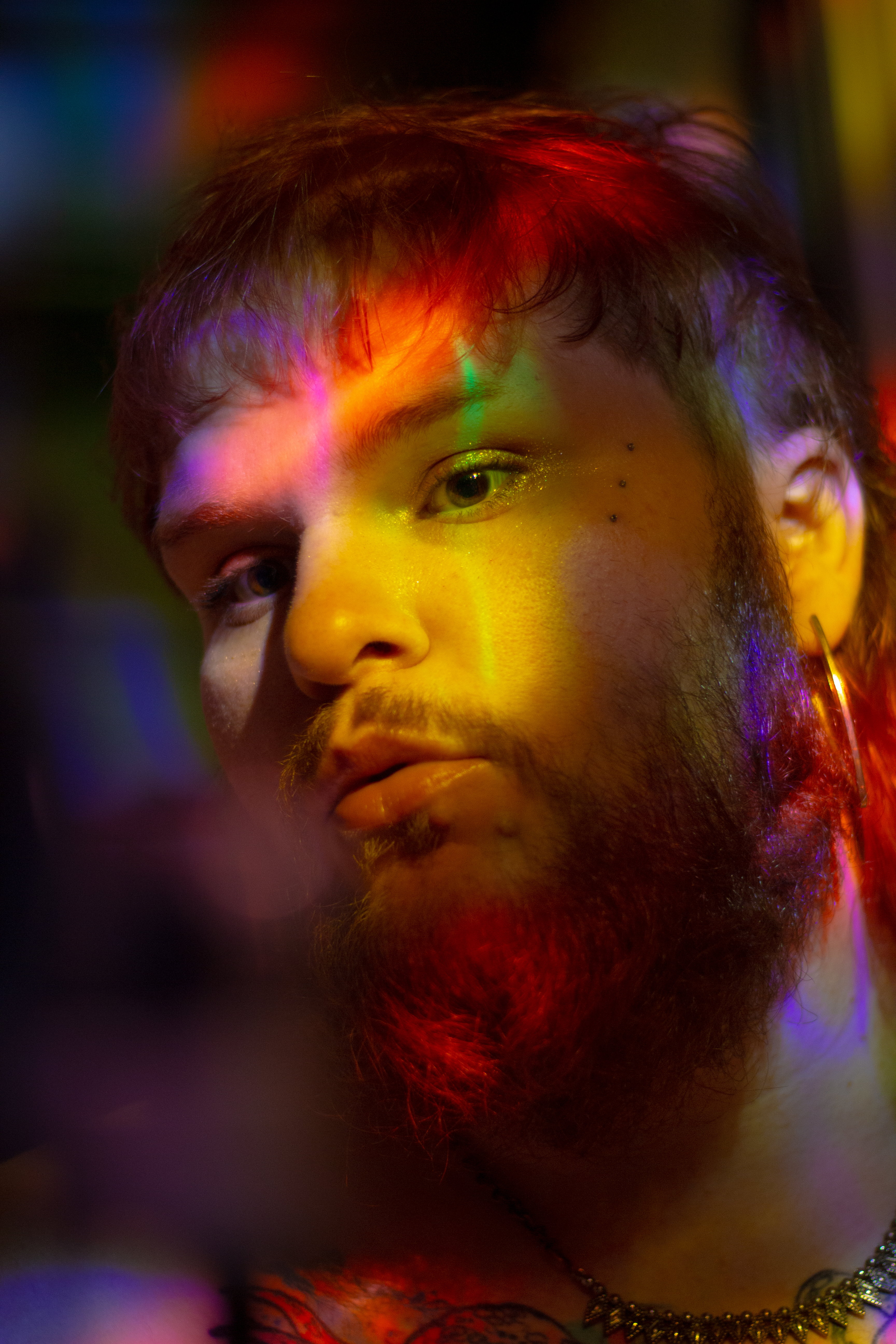 Shot with a Canon Rebel T5, 50mm lens, ISO 400, shutter speeds 1/10-1/15, shooting into a mirror with a small LED disco ball as my only light source in an otherwise unlit room at night.